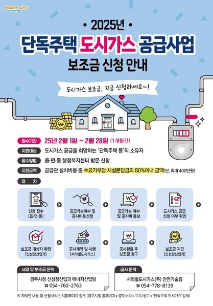 [경남도민뉴스=이돈휘 기자] 경주시는 사업비 6억 원을 확보해 도시가스 공급여건이 열악한 지역의 단독주택에 도시가스 공급관 설치비를 보조하는 ‘2025년 단독주택 도시가스 공급 보조사업’을 시행한다고 19일 밝혔다.