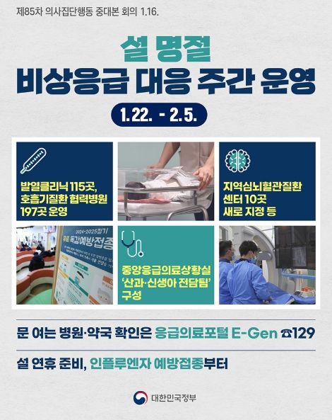 [경남도민뉴스=공동 기자] 정부는 16일 제85차 의사 집단행동 중대본 회의를 열고 '설 연휴 대비 응급의료체계 유지 특별대책'을 논의했습니다. 1월 22일부터 2월 5일까지 2주간을 '설 명절 비상응급 대응 주간'으로 지정하고 응급의료를 안정적으로 유지할 수 있도록 대책을 적극 추진합니다.
