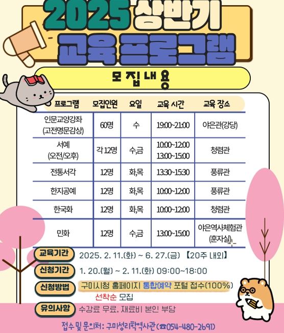 [경남도민뉴스=이돈휘 기자] 구미시는 1월 20일부터 2월 11일까지 직장인과 재학생 등 구미시민을 대상으로 상반기 교육프로그램 수강생을 선착순 모집한다.