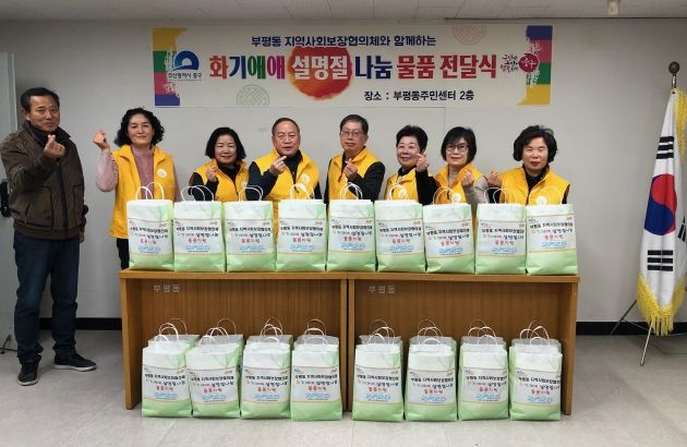 [경남도민뉴스=김채연 기자] 부평동 주민센터는 동 지역사회보장협의체와 함께 지난 17일 민·관 협력으로 '화기애애 설명절 나눔'물품 전달식을 진행했다.