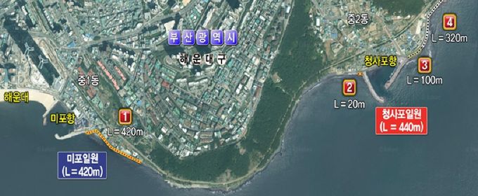 이번 사업은 미포항과 청사포항 해안가 일대의 태풍과 해일 피해를 예방하기 위한 정비사업으로, 총 사업비 308억 원(국비 154억 원, 지방비 154억 원)을 투입하여 월파 및 세굴방지시설(860m)등을 설치할 예정이다.