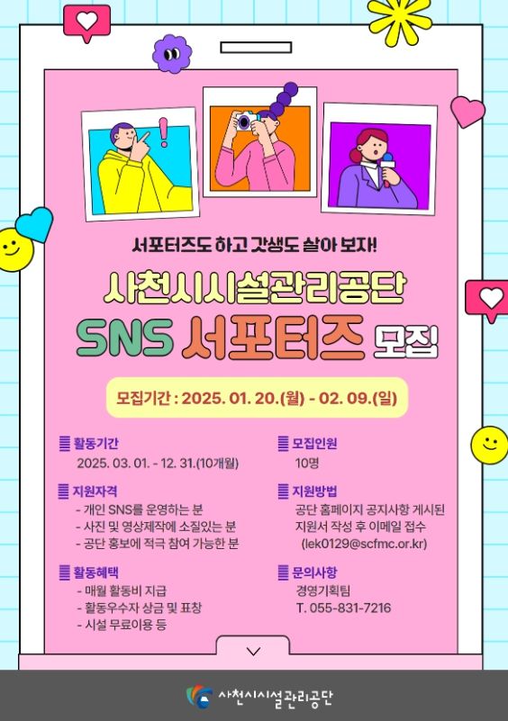 서포터즈 모집 관련 자세한 사항은 사천시시설관리공단 홈페이지를 참조하거나 기획팀(055-831-7216)으로 문의하면 된다.