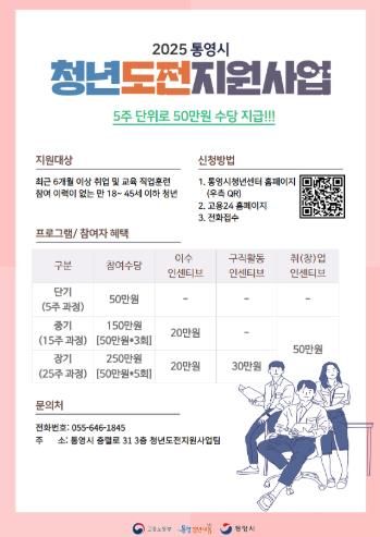 [경남도민뉴스=김부경 기자] 통영시는 6개월 이상 취(창)업·교육·직업훈련 참여 이력이 없는 18세부터 45세 청년을 대상으로 맞춤형 프로그램을 제공해 청년의 자신감 회복, 구직의욕 고취, 노동시장 참여 촉진을 지원하는 청년도전지원사업을 실시한다고 22일 밝혔다.