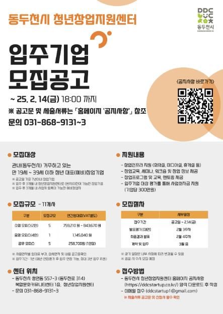 입주 신청은 2월 14일까지 이메일로 접수가 가능하다. 관련 공고문 및 신청 서식 등 자세한 내용은 동두천시청 또는 청년창업지원센터 홈페이지에서 확인할 수 있다.