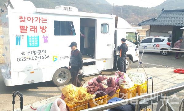 찾아가는 빨래방서비스는 경상남도에서 경남광역자활센터에 위탁해 홀몸 어르신의 대형 빨래 어려움을 덜어 드리기 위함이다. 드럼세탁기(21kg)4대와 전기온수기, 발전기, 오수저장 탱크 등이 갖춰진 이동세탁차량으로 마을을 순회해 서비스를 제공하고 있다.