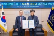 [경남도민뉴스=구인애 기자] 경상국립대학교는 진주시 내동면에 위치한 ㈜하나로비드테크 박수섭 대표가 대학발전기금 1000만 원을 기부했다고 밝혔다. 경상국립대학교 국제처는 11월 10일 오후 4시 대학본부 3층 접견실에서 권진회 총장, 오재신 국제처장, 하재필 학생처장, 김경수 국제협력부처장, 황정숙 국제협력과장, ㈜하나로비드테크 박수섭 대표와 자녀인 수의학과 박수연 학생 등 10여 명이 참석한 가운데 발전기금 전달식을 마련했다. 박수섭 대표는 전기 서비스업 분야의 ㈜하나로비드테크를 운영하며 자녀가 재학 중인 대학과 학과의 발전에 보탬이 되고자 발전기금을 기부하게 됐다고 밝혔다. 특히, 박수섭 대표는 농화학과 88학번이고, 부인 역시 동문으로서 가족 모두 대학과 특별한 인연이다. 박수섭 대표는 “자녀가 공부하는 대학이 지역과 함께 성장하는 모습을 보며 늘 응원해 왔다.”라며 “미래 인재들이 보다 나은 환경에서 배움에 전념할 수 있기를 바라는 마음으로 기부를 결심했다.”라고 소감을 전했다. 박수연 학생은 수의학과 재학생으로, 우수한 성적으로 장학금을 받고 있으며, 학과 학생회 및 근로활동