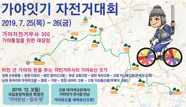 (합천/권연홍 기자) = 국립중앙박물관(관장 배기동)은 오는 12월 3일에 개막하는 특별전 ‘가야본성-칼과 현’을 홍보하고, 가야 고분군의 세계문화유산 등재를 기원하기 위해 오는 25일과 26일 이틀 동안 주요 가야 고분군을 돌아보는 ‘가야 잇기 자전거 대회’를 실시한다. 이 대회에서는 배기동 관장과 국립박물관 직원을 비롯하여 경상남북도와 전라북도, 김해시, 남원시, 함안군, 창녕군, 합천군, 고령군 직원과 해당 지역 주민들 약 300여 명이 참여하여 각 시군의 가야 유적을 자전거로 여행한다. 첫날 오는 25일 오후 1시 30분에 김해 수로왕릉 광장에서 도내 주요 인사들과 대회 참가자 200여 명이 모여 출정식과 자전거 행진을 실시한 후, 김해 대성동 고분군부터 함안 말이산 고분군까지 약 70여 km의 자전거 장정이 이어진다. 둘째 날 26일에는 함안 말이산 고분을 출발하여 창녕 교동 고분~합천 옥전 고분~고령 지산동 고분까지 90여 km를 여행하고, 전라북도 남원시 유곡리와 두락리 고분군에서도 전라북도와 남원시 참여자들이 출정식을 한 후 고령까지 85km를 달려와 합류하여 영호남이 어우러진 자리를 마련한다.