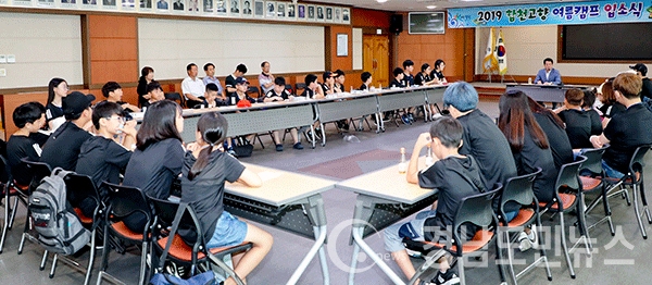 (합천/권연홍 기자) = 합천군(군수 문준희)은 29일 군청 3층 대회의실에서 향우 2~3세를 대상으로 하는 ‘2019 합천 고향 여름 캠프’ 입소식을 개최했다고 밝혔다. 합천군과 합천군 고향발전위원회가 공동 주관하는 이번 캠프는 29일부터 오는 31일까지 2박3일의 일정으로 진행된다. 특히, 올해는 재외향우회(회장 지정도)에서 기금 1천만 원을 후세들에게 흔쾌히 지원하여 군비를 합하여 총2천5백만 원의 사업비로 시행한다. 제4회를 맞은 합천 고향 여름 캠프는 타지에 거주하는 향우 2~3세 자녀들에게 부모님의 고향 합천을 바로 알리고, 합천인으로서 긍지를 고취시키기 위한 취지로 추진됐다. 이번 고향캠프에는 각 지역 향우회와 언론, 홈페이지를 통한 선착순 모집으로 총 35명이 참가했다. 초등학생 21명, 중학생 10명, 고등학생 1명, 대학생1명, 미취학 2명이 선정된 이번 캠프는 창원, 대구, 부산, 진주, 거제, 통영, 파주 등 전국 각지의 향우 자녀들이 합천의 대표 관광지를 관람하고, 이색 여름 축제를 경험한다. 캠프 첫날에는 입소식을 시작으로 삼가에 위치한 남명생가, 용암서원, 번개들을 차례로 방문해 옛날 선조들의 문화와 정신을