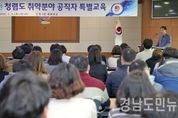 (합천/권연홍 기자) = 합천군은 지난 4일 군청 3층 대회의실에서 공사․계약 및 인․허가 업무담당자를 포함한 공무원 100여 명이 참석한 가운데 ‘공직자 청렴 특별교육’을 실시했다. 이 날의 교육은 정판용 합천 부군수 주재로 실시됐으며, 2018년도 청렴도 평가결과를 분석하고 2019년 청렴도 취약분야에 대하여 향상 방안을 논의하는 등 군민들의 높아진 윤리적 기준에 맞는 공직자의 자세와 윤리의식 정착 등 공직자 청렴도 향상 분위기를 조성하기 위해 마련됐다. 뿐만 아니라, 직원들의 공직기강 확립을 위하여 음주운전 근절에 대한 거듭된 강조와 관련 주의사항을 전달했으며 부정청탁금지법 및 행동강령에 대하여도 설명했다. 교육을 마무리하면서, 정판용 부군수는 “직원 한명 한명의 청렴한 마음이 모여 청렴한 합천군이 실현될 수 있기에 우리군의 청렴도 향상을 위해 직원들이 한마음 한뜻으로 애써주기를 당부하며, 앞으로도 직원들과 직접 소통할 수 있도록 하겠다”고 전했다.