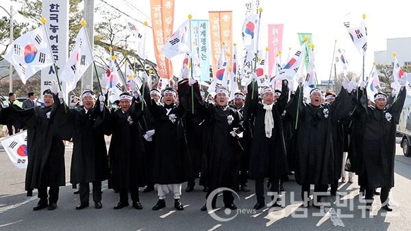 (합천/권연홍 기자) = 합천군(군수 문준희)은 19일 3·1 독립만세운동 100주년을 맞아 독립유공자, 유림회, 유관기관 및 사회단체, 학생, 주민 등 2,000여명이 참석한 가운데 3·1 독립만세운동재현행사를 개최했다. 이날 행사는 3·1독립만세운동재현행사추진위원회(위원장 차세운)에 주관하여 합천문화예술회관에서 출발 만세운동과 총포사격을 재연하면서 일해공원 3·1독립운동 기념탑까지 시가지 행진을 진행했다. 행사장 도착후 식전행사로 플래시 몹(독도는 우리 땅), 재연뮤지컬(헌시 및 살풀이)에 이어 본 행사에는 헌화 및 분향, 독립선언문 낭독, 기념사 및 축사 등으로 진행하며 순국 선열들의 숭고한 넋을 기렸다. 올해는 3·1 독립만세운동과 대한민국임시정부수립 100주년의 해로 이를 기념하기 지난 15일부터 합천군민 횃불릴레이와 학생, 유림, 기관·사회단체 등 각계 분야 군민들의 독립선언문 낭독 릴레이 실시해 눈길을 끌었다. 특히 횃불릴레이는 독립유공자 및 후손, 각계 대표 등을 봉송주자로 선발하여 3일간 가야·초계·삼가·합천시장을 돌며 대한독립만