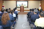 (합천/권연홍 기자) = 합천군(군수 문준희)은 3일 군청 대회의실에서 본청직원 및 읍·면장 등 250여 명의 공직자가 참석한 가운데 민선7기 첫 직원 정례조회를 개최했다. 문준희 군수는 당초 지난 2일 예정됐던 취임식을 전격 취소하고, 재해예방 현장점검을 실시했다. 그에 따라 이날 정례조회에서 취임에 즈음한 향후 군정방향과 대군민 메시지를 전달했다 정례조회 취임인사에서 합천군의 발전 방향에 대한 역할과 의지를 밝히며 ‘황강 직강공사, 국제복합도시 유치, 신재생 발전단지 조성 등 어려워 보이는 과제이지만 발상의 전환을 통해 앞장서겠다’며 새로운 도전이 합천의 미래임을 강조했다. 이어 농축산업의 6차산업화, 친환경 고부가 가치화를 통한 부자농촌 건설과 황매산-영상테마파크-황강-해인사 관광벨트 연결을 통한 ‘돈이 되는 관광산업’ 기반 육성에 대해 강조하며, 각종 규제개혁과 인프라 조성에 힘써 줄 것을 당부했다. 특히 합천군 미래를 만드는 책임은 공직자에게 있음을 강조하며, 개개인이 가지고 있는 개성에 따라, 성실성과 열정, 그리고 아이디어를 통해 군의 발전에 적극 기여해 줄 것을 요구했다.