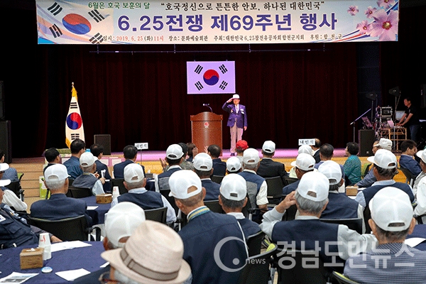 (합천/권연홍 기자) = 합천군(군수 문준희)은 6.25전쟁 제69주년을 맞아 25일 문화예술회관에서문준희 군수를 비롯한 관내 기관·사회단체장 및 보훈단체장, 6.25 참전유공자, 보훈가족 등 400여 명이 참석한 가운데 6.25전쟁 제69주년기념 행사를 개최했다. 이 날 기념행사는 국민의례, 표창장 수여, 대회사, 격려사, 6.25노래 제창 순으로 진행됐으며, 6.25참전유공자 표창 및 장한용사상 수여식을 가져 더 뜻 깊은 자리가 됐다. 또한 6.25전쟁의 역사적 의의를 되새기고 전사자 추모 및 참전용사의 희생과 공헌을 기리고, 호국영령의 넋을 위로하며 참전용사에 대한 감사한 마음을 전했다. 김정갑 6.25참전유공자회 합천군지회장은 대회사에서 “6.25전쟁의 참상을 되새겨 보고 다시는 이와 같은 불행한 일이 일어나지 않도록 결의를 다지자”고 전했다. 문준희 군수는 격려사를 통해 “나라를 위해 헌신하신 선열들이 없었으면 오늘날과 같은 발전을 이루지 못했을 것”이라며 “오늘 이 자리를 통해 선열들의 고귀한 희생에 군민 모두의 감사와 존경의 마음을 전하고, 하나 되는 대한민국으로 보답하는 뜻 깊