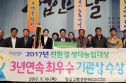 (합천/권연홍 기자) = 합천군(군수 하창환)은 경상남도에서 추진하는 친환경 생태농업육성 평가에서 3년연속 최우수상을 수상하는 쾌거를 이뤘다. 창원 컨벤션센터에서 16일 열린 '제22회 농업인의 날' 행사에서 합천군이 최우수 기관상 도지사 표창과 상사업비 5,000만원을 받았다. 경남도 18개 시군을 대상으로 7개 분야에 대해서 평가한 결과 합천군은 국도비 친환경지원단지의 인증율과 전년대비 친환경인증면적 증가률, 자체사업 실적 등 친환경농업 활성화에 높게 평가를 받았다. 합천군은 올해 명품복합친환경원예단지 및 간이 퇴비장 설치 등 국도비사업 28억원 및 군 자체사업 8억8200만원을 투입해 친환경시설원예 및 아로니아, 마늘단지 등 친환경단지를 조성하였으며 ‘소비자 신뢰에 기반한 지속가능한 친환경농업실천’이라는 비전아래 친환경농업 단지화․규모화로 학교급식, 한살림 등 직거래를 확대하고 아이쿱생협과 업무협약을 체결하는 등 안정적인 유통망을 구축하는 등 소비확대에 전력을 기울였다. 정년효 농업기술센터소장은 "2020년까지 친환경농산물 재배면적 비율을 경지면적 대비 8%까지 늘리고 친환경 학교급식 및 소비자단