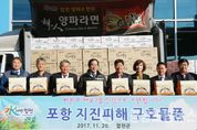 (합천/권연홍 기자) = 합천군(군수 하창환)과 합천유통(대표 장문철)은 20일 유례없는 지진으로 큰 피해를 입은 포항시 이재민에게 약 5백만원 상당의 긴급 구호물품을 전달했다. 이날 전달된 물품은 합천군에서 개발한 ‘해와人 양파 즉석떡국’ 80박스와 ‘양파라면’ 30박스로 약 2,000인분이며, 포항시 양덕 한마음체육관을 방문해 이재민에게 직접 전달하고 따뜻한 온정을 나눴다. 군 관계자는 “지난 10월 20일부터 11월 5일까지 17일간 열린 대장경세계문화축전 행사에 포항시민들의 많은 참여 덕분에 성공적으로 개최할 수 있었다”며, “갑작스런 지진 발생으로 어려움을 겪고 있는 포항시민에게 합천군민의 마음을 담아 구호물품을 전달하게 됐다”고 말했다. 하창환 합천군수는 "자연재해로 고통 받고 있는 주민들이 어려움을 딛고 다시 정상적인 생활을 하실 수 있도록 조금이나마 보탬이 됐으면 한다"고 밝혔다. 한편 <해와人 양파 즉석떡국>은 합천 쌀과 양파를 100% 사용해 군내 쌀 소비 촉진과 합천 양파의 우수성을 널리 알리기 위해 개발한 편의식 즉석식품이