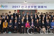 (합천/권연홍 기자) = 합천군(군수 하창환)은 7일, 군청 대회의실에서 신규 공무원 20명과 가족 30여명이 참석한 가운데 ‘2017년 합천군 신규공무원 임용식’을 가졌다. 이날 임용식은 임용장 수여, 공무원 선서, 하창환 군수의 축하와 당부, 부모님과의 간담회, 기념촬영, 군정 주요현황 소개 순으로 진행됐으며, 공직자로서의 기본 직무교육과 함께 대장경테마파크 등 주요 현장을 둘러보는 시간도 함께 가졌다. 특히 이날은 하창환 군수가 뒷바라지를 위해 많은 노력을 기울인 부모님에게 꽃다발을 전달하며 감사의 마음을 전했으며, 자랑스러운 공무원으로 임용되는 순간을 가족과 함께해 긍지와 자부심을 고취시키는 자리가 됐다. 이번 합천군의 신규임용 공무원은 행정직을 비롯해 총 8개직렬 20명으로 전원 본청에 배치 받아 근무하게 된다. 하창환 군수는 인사말을 통해 “치열한 경쟁을 뚫고 공직에 입문한 우수한 후배 공직자들이 열정을 가지고 모든 일에 성실히 임해주길 바라며, 군민과 지역을 위해 나아가 나라를 위해 일한다는 자부심을 가져달라”고 당부했다.