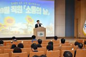 [경남도민뉴스=나희준 기자] 경남 밀양시는 1일 시청 대강당에서 본청, 직속 기관, 읍면동, 산하기관 등 직원 300여 명이 참석한 가운데 ‘9월 직원 소통의 날’을 개최했다고 밝혔다. 이번 소통의 날은 표창장 수여, 공공배달앱 ‘땡겨요’ 및 ‘뜨거웠던 우리의 여름’ 영상 시청, 나노융합 국가산업단지 기회발전특구 현황 발표, 시장 훈시 말씀, 소통 이벤트 순으로 진행됐다. 특히 이번부터는 지역 사회에 귀감이 되는 시민을 적극 발굴해 감사패와 표창장을 수여하며 감사와 격려의 뜻을 전했다. △수해 현장 긴급 복구에 도움을 준 시민과 단체 △폭염으로 쓰러진 어르신의 생명을 구한 시민 △어려운 환경 속에서도 유족연금을 모아 양육시설에 물품을 기탁한 시민 △농촌지역 대동물 진료 공백 해소에 기여한 시민 등 지역 사회 발전에 힘쓴 시민 19명이 감사패와 표창장을 받았다. 또한, 자랑스러운 공무원으로 선발된 직원 3명에게도 도지사 표창이 수여됐다. 이어 지난 8월부터 운영된 공공배달앱 ‘땡겨요’ 홍보영상과 7~8월 무더위 속에서 함께한 활동 영상을 시청하며 직원 간에 서로 격려하는 시간을 가졌다.