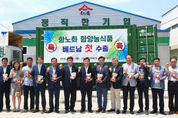 (함양/박현섭 기자) = 지난 4월 베트남 시장개척활동에서 627만 달러(71억원)의 항노화 함양농식품 수출계약을 달성했던 함양군(군수 임창호)이 23일 오전 함양읍 이은리 농업회사법인 우리가(대표 하경수)에서 만든 삼계탕 10톤(1kg 9600개) 3000만원 물량을 마침내 역사적인 첫 수출 선적식을 가졌다. 삼계탕은 이날 첫 선적을 시작으로 2018년 5월까지 2년간 수입업체 해피쿡(대표 최외석)을 통해 매월 20ft 1컨테이너 물량씩 총 231톤 7억여원 어치 수출되고, 임창호 군수, 황태진 군의회의장, 박종일 경남도 농산물유통과장, 여일구 NH농협 함양군지부장, 김승교 함양군 수출진흥협회장, 박태우 함양군 농식품가공협회장 등 30여명이 참석해 축하했다. 오는 산삼축제 기간인 7월 31일부터 8월 2일까지 사흘간 종합사회복지관과산삼축제 농산물판매장에서 바이어와 수출업체 50개소가 참여한 가운데 베트남바이어 초청 상담회를 개최할 계획이며, 11월께 2차 베트남 시장개척에 나설 방침이고, 지난 4월 베트남시장개척활동에서 새송이 버섯, 사과, 삼계탕 등을 취급하는 함양농협, 함양산양삼, 우리가, 고운 등 10개 업체가 627만달러(한화 71억여원)의 수출계