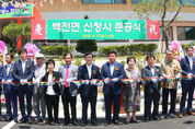 (함양=경남도민뉴스) 박현섭 기자 = 지리산 청정 오미자의 고장 함양군 백전면에 산뜻한 새 청사가 들어서 백전면민에 대한 다양한 행정서비스가 이뤄질 수 있게 됐다. 함양군(군수 임창호)은 17일 백전면 구산대안로 10-3 신청사 앞 광장에서 임창호 군수, 강석진 국회의원 부인 신효정 여사, 황태진 군의회 의장 및 군의원 기타 지역단체 및 주민, 각 읍면장 및 이장단협의회장, 백전면향우회 등이 참석해 400여명의 관계자가 참석한 가운데 백전면 신청사 준공식을 개최했다. 백전면 백운산 풍물패와 함양군·백전면 노래교실의 식전 축하공연에 이어 국민의례, 내빈소개, 경과보고, 표창장 및 감사패 수여, 임창호 군수 인사말, 축사, 청사건립추진위원장 감사인사, 기념식수, 개청테이프커팅 순으로 진행됐고, 시공사 세광건설(주) 문봉갑씨, 청사건립 김광곤추진위원장, 재무과 임도경주무관이 군수 표창장을 받았으며, 김영철 전 백전면장이 청사건립추진위로부터 감사패를 받았다. 백전면 청사는 1964년 건립돼 1984년 한차례 2층으로 증축돼 사용돼 오다 리모델링에는 한계가 있어 백전면민 숙원사업으로 신축이 추진되어 총 사업비 28억 9500만원을 들여 지난 해 6월부터