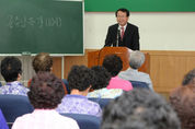 (거창= 경남도민뉴스) 박현섭 기자 = 양동인 거창군수가 지난 20일 ‘군민이 행복한 거창’이라는 주제로 노인대학 특강을 가졌다. 대한노인회 부설 노인대학(학장 성명숙)의 요청으로 60여명의 학생들이 참가한 가운데 1시간 동안 진행됐다. 양 군수는 “시간을 할애해 준 노인회에 감사드리고, 귀중한 시간을 내어 참석해 주신데 무척 고맙다”는 인사말에 이어, 군민 행복의 조건으로 ‘기반을 조성하는 군정의 운영방향, 어르신들에 드리는 말씀, 대화의 시간’으로 특강을 가졌다. 행복기반을 위한 경제 활성화로 크게 2가지 구상을 밝혔다. 첫 번째는 “청년 일자리다. 내륙권에 위치한 거창군이 기업하기에 불리한 여건을 극복하기 위해서는 차별화된 기업유치 전략이 필요하다. 모양을 갖춰가는 승강기 산업으로 관련 기업들이 찾아올 수 밖에 없도록 기반을 더 다지겠다”고 자신의 생각을 밝혔다. 두 번째는 “지난해 12월 확장 개통된 대구광주고속도로로 인해 소위 ‘빨대효과’를 염려한다. 지역 경제와 인구가 대구권으로 빨려 들어갈 것이라는 우려가 많다. 바꾸어 생