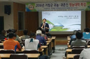 (거창=경남도민뉴스) 박현섭 기자 = 거창군(군수 양동인)은 지난 20일 귀농․귀촌인 영농대학을 위탁 운영하고 있는 거창군 농업인회의소에서 지역농업네트워크협동조합 박영범 이사장을 초청, 특강을 열었다. 박영범 이사장은 ‘바뀌는 세상, 우리가 할 일’이라는 주제로 강의를 하면서, 귀농․귀촌인들의 주류를 이루는 베이비부머 세대들의 끈기와 노력은 거품이 아닌 경쟁력 있는 경제력이다. 다음 세대들이 겪지 못한 시대를 살아온 주역들이고, 농촌 경제를 살리고 지역, 협동, 생활경제를 살리는 새로운 주인공이다. 그러나 급변하는 시대를 살아가기 위해 ‘세상을 읽고 적응하기 위해’ 변화지 않으면 안된다‘는 요지로 강의를 했다. 농번기의 야간임에도 배움의 열기로 가득했다. 한 교육생은 “바쁜 영농철에 일하는 농민들을 배려해서 저녁 강의를 하러 오신 강사님께 감사한다”며 “영농기술뿐 아니라 귀농․귀촌인들에게 필요한 경제적 시선과 현실을 일깨워주는 좋은 교육이었다”고 말했다. 한편, 귀농․귀촌인 영농 대학은 올해 2회째로, 사과반, 딸기반