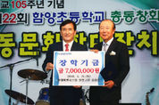 (함양=경남도민뉴스) 박현섭 기자 = 함양군(군수 임창호)은 함양출신 현대비앤지스틸 상임고문 유홍종(79)씨가 지난 21일 함양초등학교 총동창회 행사장에서 ‘자랑스런 함초인상’을 수상하고, 훌륭한 인재양성과 고향발전을 기원하며 (사)함양군장학회에 장학금 700만원을 기탁했다. 유씨는 “함양초등학교를 졸업한 뒤 줄곧 외지에서 생활하면서도 마음은 늘 고향동무와 뛰놀던 고향땅을 향하곤 했다”며 “이렇게 소중한 상을 줘 너무 감사하다. 오늘 내놓은 작은 성의가 후배들과 고향을 위한 의미있는 밑거름이 되길 바란다”고 말했다. 유홍종씨는 서울대학교를 나와 1969년 현대자동차 입사한 뒤 줄곧 현대인으로 살아왔으며, 2002년 비앤지스틸 회장취임, 2002년 부산아시안게임 국가대표선수단 단장, 대한양궁협회 6~7대회장 등을 역임했다. 현재는 고령에도 노익장을 과시하며 현재 현대비앤지스틸 상임고문으로 활동하고 있다.