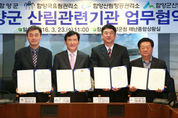 함양군 산림관련기관 4곳이 함양군 발전견인을 다짐하는 업무협약을 체결해, 2020함양산삼항노화엑스포 개최 및 산지자원화사업에 큰 탄력을 받게 됐다. 함양군은 23일 함양 국유림관리소(소장 권창환), 함양 산림항공관리소(소장 강경우), 함양군 산림조합(조합장 정욱상) 등 3개 기관과 산림관련 업무 협약식을 체결했다. 산림면적이 78%인 함양군은 산에서 소득을 찾아야 하는 대표적인 산촌지역으로, 군을 비롯해 함양 국유림관리소, 함양 산림항공관리소, 함양군 산림조합 등 산림관련기관이 4개 기관이 있는 전국에서 유일한 지방자치단체다. 실제로 군은 지리산, 남덕유산 국립공원, 대봉산, 황석산 등 1000m이상 산봉우리가 15개 소재하고 있어 ‘산이 곧 돈이 된다’는 모토로 산지에서 소득을 창출하기 위해 군정 업무를 역점적으로 추진해왔다. 이를 위해 5만 6000여ha 산림에서 생산·체험·유통을 통한 산지소득을 창출코자 자연 휴양림 4개소, 산촌생태마을 4개소, 1000억원이 투자되는 대봉산 산삼휴양밸리 조성사업 등 대규모 사업을 투자해오고 있다. 이런 노력 덕분에 해발 600m가 넘는 숲속에 450농가, 700h