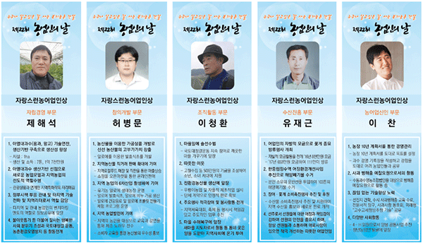(창원/심지윤 기자) = 경남도는 ‘제22회 농업인의 날’을 맞아 ‘누구나 살고 싶은 잘 사는 복지농촌 건설!’ 이라는 슬로건 아래 농업인과 도민이 함께하는 화합의 장을 마련했다. 16일 창원컨벤션센터에서 열린 이날 행사에는 한경호 도지사 권한대행, 박동식 도의회 의장, 이구환 농협중앙회경남본부장 등 주요인사와 도내 농업인, 농업인단체 등 400여 명이 참석했다. 이번 행사는 농업용 드론, 무인항공방제기와 같은 첨단 농업용 장비와, 도내 우수 브랜드 쌀, 명품과일 ‘이로로’, 수출농산품, 유기농자재 등 다양한 볼거리와 함께 기념식이 진행됐다 시상식에서는 ‘자랑스런 농어업인상’, ‘친환경 생태농업 우수 시군상’, ‘우수 브랜드 쌀 표창’, ‘농업인의 날 유공자 표창’ 등 총 4개 부문에 30명이 도지사 표창과 상장을 수상했다. 특히, 경남 최고의 농어업인을 뽑는 자랑스런 농어업인상의 부문별 수상자는 ‘자립경영부문’에 통영시 제해석 씨, ‘창의개발부문’에 김해시 허병문