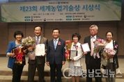 (창원/심지윤 기자) = 경남도 출신의 3명이 농업분야에서 경쟁력을 인정받아 제23회 세계농업기술상을 수여받았다. 농촌진흥청과 세계일보가 주관하는 제23회 세게농업기술상 시상식은 농업에 혁신적이면서도 차별화된 아이디어로 고부가가치를 창출해내는 우수 농업인과 단체를 발굴해 지난 4일 서울 한국프레스센터 20층 국제회의장에서 시상했다. 이번 시상식에서는 김원윤(66.김해)씨가 기술개발 부문에서 대상을 수상했고, 김행렬(60.함안) 함안수박생산자협의회 대표가 협동영농 부문에서 우수상을 수상했다. 이혜원(57.김해) 김해시농업기술센터 지도사는 지도기관 유공 특별상을 수상했다. 김원윤 씨는 '장미 명인'으로 불리울 만큼 가시 없는 장미, 저온재배용 장미, 내병성 장미 등 12종의 장미를 새로 개발하는 등 장미에 대한 지대한 관심을 가지고 한국 절화장미 산업 발전에 기여한 공을 인정받아 '대상'을 받는 영예를 안았다. 김행렬 대표는 함안수박축제행사 추진과 공동 브랜드 출하로 함안 수박의 경쟁력을 높이고, 컬러수박 등 새로운 소득자목을 육성하는 등 농업인 소득 창출에도 기여한 것으로 인정받아 '우수상'을 받았다. 이혜원