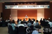 (창원/심지윤 기자) = 경남도는 16일 창원컨벤션센터에서 관계 공무원, 유관기관, 기업 등 100여명이 참석한 가운데 ‘2017년 경남 신재생에너지 대상’을 개최했다. 도와 창원시가 공동 주최하고, 한국에너지공단 경남지역본부가 주관하는 ‘신재생에너지 대상’은 올해 4회째를 맞이했다. 기술개발, 보급사업 등 각 분야에서 신재생에너지 산업 발전에 이바지한 유공자에 대한 포상과 정책·산업동향 등 정보교류를 통해 도내 신재생에너지 산업 발전에 기여해 왔다. 이날 행사에서는 신재생에너지 산업 발전에 기여한 각계 유공자 총 9명에 대해 경남도지사상, 창원시장상, 한국에너지공단이사장상 등의 표창이 수여됐다. 이어진 정책 설명회에서는 ▲주인호 한국수자원공사 합천댐관리단 운영부장의 ‘수상태양광 추진현황 및 보급사례’, ▲김지효 에너지경제연구원 에너지수요관리연구실 연구위원의 ‘4차 산업혁명과 에너지’, ▲이연상 한국에너지공단 신재생에너지육성실 차장의 ‘농촌태양광 보급 활성화 정책’ 등 4차 산업혁명 시대의 신재생에너지 발전 방안과, 지역특성을 활용한