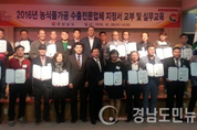 (창원/심지윤 기자) = 경남도는 미래농업 50년을 대비를 일환으로 ‘혁신, 경남농정 2050 프로젝트’를 추진하기 위해 26일 도청 서부청사에서 농식품가공 수출전문업체 40개소를 지정하고 참석자를 대상 실무교육을 실시했다. 도 수출업체, 수출관계자, 시·군 공무원 등 60여 명이 참석한 가운데 도는 이번 농식품가공 수출전문업체 지정을 통해 수출잠재력이 있는 도내 가공업체를 오는 2018년까지 200개소로 확대 육성하며, 수출 기반조성과 대외경쟁력을 강화할 방침이다. 또한, 도는 참가자를 대상으로 실무교육을 개최해 올해 농수산물 수출목표 ‘16억 불’ 달성에 필요한 농식품 가공업체 주요수출 지원 정책, 대중국 수출확대 방안, 우수사례 등을 설명하고 수출현장의 애로사항을 청취하는 시간을 가졌다. 조규일 경남도 서부부지사는 “국가 간 FTA 타결이 우리 농업에 있어 위기임이 분명하지만, 새로운 아이디어와 품질 좋은 상품을 만들어 적극적으로 해외 시장을 공략해 나간다면 오히려 위기를 기회로 바꿀 수 있다”며 “도 지정 수출전문업체의 자부심과 긍지를 가지고 수출을 위해 적극