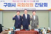 [경남도민뉴스=오창경 기자] 구미시는 9월 30일 국회를 방문해 구자근, 강명구 지역구 국회의원과 간담회를 열고 지역 주요 현안과 국비 확보 전략을 논의했다. 이날 간담회에는 김장호 시장을 비롯해 구미시 주요 간부 공무원 등 30여 명이 참석했다. 시는 현안 사업 추진 상황과 정부 예산 동향을 공유하며 국회 차원의 전략적 지원 방안을 모색했다. 주요 현안사업으로는 △구미국가산업단지 1~3단지 연결교량 신설 △구미~신공항 철도건설 △대한민국역사박물관(구미산업화역사관) 건립 △새마을운동중앙회 및 연수원 유치 △'5극 3특'국가균형성장 전략 대응 △한국은행 구미지역본부 유치 △'방위산업 소재ㆍ부품ㆍ장비 특화단지'유치 △국가 푸드테크 클러스터 조성 등이 논의됐다. 주요 국비사업으로 △구미시 제조창업 인큐베이팅 센터 구축 △AX 실증산단 구축 사업 △지역 주력 중소기업형 인공지능 데이터 스페이스 구축 △차세대 디스플레이 핵심부품ㆍ소재 기술개발 △반도체 장비 챔버용 소재부품 제조 및 검증 테스트베드 구축 △수요확대형 배터리 테스트베드 구축 △구미 산동 국민체육센터 조성 △푸드테크 연구지원센터 구축 △펫테크 산업화 지원센터 구축 △4단