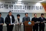 (사천/이형섭 기자) = 경남 사천시민참여연대(대표 박종순)는 20일 오전 10시 30분 사천시청 브리핑룸에서 사천, 삼천, 포항 노선을 포함하는 김천~거제 간 남부내륙고속철도사업 조기 착공을 촉구하는 기자회견을 가졌다. 사천시민참여연대는 기자회견을 통해 서부경남 도민들의 오랜 염원이며 대선공약 사업인 김천~거제 간 남부내륙철도사업 조기 착공을 반드시 이행할 것을 촉구했다. 참여연대는 “삼천포항은 최첨단 항공우주산업과 공군부대 전투기 훈련비행장과 삼천포화력발전소 등 국가산업 및 군사 전략지로서 교통수요가 많을 것으로 전망된다“며, “삼천포항은 산업물류 및 군사전략 요충지란 면에서 반드시 남부내륙고속철도 노선에 포함시켜야 한다”고 주장했다. 참여연대는 특히 "19대 대선 때 박근헤 대통령 후보 공약으로 김천~합천~진주~삼천포항~고성~통영~거제로 잇는 노선으로 변경 남부내륙고속철도사업을 추진하겠다고 했으나, 국토교통부는 철도건설과 실무진이 현지답사도 없이 이 노선(김천-거제)의 가장 핵심인 삼천포항을 타당성 검토도 하지 않고 노선 연장 증가로 인한 사업비가 늘어나 경제성이 하락할 우려