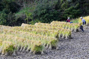 (산청/정우태 기자) = 25일 친환경 쌀 재배지로 널리 알려진 산청군 오부면 일물마을의 한 논에서 김봉수(81)씨 부부가 낫을 들고 직접 가을걷이를 하고 있다. 추수한 벼는 단을 만들어 엇갈려 세워 햇빛과 바람을 이용해 말린다. 기계화 된 현대 벼농사에서는 보기 드문 모습이다. 한편 산청군 오부면은 메뚜기쌀, 슈퍼복분자 등 다양한 친환경 농특산물을 생산하는 대표적인 친환경 영농지다.