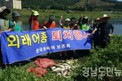 (산청/정우태 기자) = 쏘가리, 꺽지 등 산청지역 토속어종 보호에 앞장서고 있는 한국토속어보존회 산청군지회(이하 산청토속어보존회)가 외래어종 퇴치를 위해 발 벗고 나섰다. 산청토속어보존회는 지난 24일 산청군 신안면 상정마을 앞 양천강변에서 하천 생태계 교란의 주범인 ‘배스’ 퇴치활동을 펼쳤다. 이날 활동에는 한국토속어보존회 회원 20여명이 자원봉사자로 참가해 그물 등을 이용, 150㎏가량의 배스를 포획했다. 배스는 환경부에서 지정·고시한 대표적인 생태계 교란 외래어종이다. 주로 저수지나 유속이 느린 하천에서 서식하며 토종어류를 닥치는 대로 섭식해 토종어류 개체수를 급격하게 감소시킨다. 특히 번식력이 왕성해 수중 생태계를 교란시키는 유해 어종으로 문제가 되고 있다. 배종영 한국토속어보존회 산청군지회장은 “이번 활동이 수중 생태계를 교란하는 외래어종 퇴치에 대한 군민의 관심을 높이는데 일조하기를 기대한다”며 “앞으로도 자연생태계 회복과 보전을 위해 지속적인 활동을 펼치겠다”고 밝혔다.