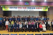 (함양/정희나 기자) = 함양군은 지난 17일 오후 4시 농업기술센터 농업인교육관에서 손병규 부군수, 임재구 군의회의장, 진병영 도의원, 이재욱 농축산과장, 수강생 105명 등 120여명이 참석한 가운데 2017년 귀농귀촌전문교육 수료식을 개최했다고 지난 18일 밝혔다. 지난달 3일부터 이날까지 주 2회 총 60시간 진행된 이번 교육에는 122명이 교육에 참여해 최근 들어 바뀌고 있는 귀농·귀촌 정책 방향과 지원내용안내, 경영정보설계 정보제공, 귀농자가 반드시 알아야할 경영기법 및 문제해결능력배양 등을 주 내용으로 이론과 실습을 겸한 맞춤형 교육을 받았으며, 교육일정의 70%이상을 소화한 수료생은 106명이다. 이날 수료식은 귀농귀촌교육의 질적 향상을 위한 설문조사 시책설명 소감발표에 이어 개회, 국민의례, 수료증 수여, 인사말, 기념촬영 순으로 진행됐다. 손병규 부군수는 인사말을 통해 “어려운 여건 속에서도 성실한 자세로 귀농귀촌교육을 수료한 수료생에 축하와 격려의 박수를 보낸다”며 “이번에 받은 교육을 토대로 영농활동에 큰 도움이 되길 바라며 제2의 고향 함양에서 성공적인 인생2막을 열며 군민소득 3만불