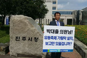 (진주/조권래 기자) = 더불어민주당 진주갑 지역위원회 정영훈 위원장이 21일 진주시청앞 도로변에서 남강유등축제 반대 1인시위를 이어가며, 새누리당 박대출(진주 갑 당협위원장)에게 남강유등축제 가림막 설치에 관한 입장을 밝힐 것을 촉구하고 나섰다. 이날 정영훈 위원장은 지난 13일 박대출 의원에게 보낸 질의공문을 통해 "지난 3월 22일 기자회견과 4월 2일 서경방송 후보자 대담, kbs 후보자 토론회 등에서 박의원은 ‘남강유등축제 유료화에는 찬성하지만 지난해처럼 천막을 이용한 가림막 설치는 반대한다. 가림막도 볼거리가 될 수 있도록 개선방안을 찾아야 한다. 이창희 시장이 설치 안 할 것이다’고 답변한 바 있다"며 "가림막 설치에 반대한다는 박대출 의원의 입장은 지금도 유효한 것인지, 올해도 가림막을 설치한다면, 진주시민의 민의를 대표하는 박대출 의원님은 어떤 조치를 취할 계획인지 밝혀주시라고 요구했으나 답변이 없다"고 밝혔다. 더불어민주당 진주갑 지역위원회 정영훈 위원장이 새누리당 진주갑 출신 박대출 국회의원에게 '남강유등축체 가림막 보고만 있을것입니까'