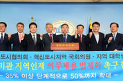 (진주/조권래 기자) = 전국혁신도시(지구)협의회, 전국혁신도시 지역구 국회의원, 혁신도시 지역 대학생 등이 5일 국회에서 혁신도시 공공기관 지역인재 의무채용 법제화를 촉구하는 성명을 발표했다. 전국혁신도시협의회(회장 김승수 전주시장) 주관으로 추진한 이번 법제화 촉구 국회합동 기자회견 행사에는 진주시장을 비롯한 혁신도시 소재 자치단체장과 지역 국회의원, 대학생 대표 등이 참석한 것으로 알려졌다. 진주시 관계자는 "기자회견을 가진 후 참여자들은 3당의 대표를 차례로 방문해 건의문을 전달하고 협조를 구하는 등 공동대응으로 이슈화를 위한 활동을 이어갔다"고 전했다. 한편, 진주시 관계자는 "이번 공동기자회견의 주된 이유는 정부가 추진하는 정규직 전환유도, 시간선택제 등의 청년고용대책은 실효성이 적을 뿐만 아니라, 혁신도시특별법, 지방대육성법 등 공공기관의 지역인재 채용 관련 조항이 대부분 권고사항으로 효과가 미미해 보다 강도 높은 대책이 필요하다고 보고 이를 법제화 해줄 것을 촉구하기 위해서다"고 밝혔다.