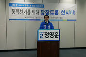 정영훈 더불어민주당 진주갑 국회의원 예비후보는 15일 진주시청 브리핑룸에서 기자회견을 열고 '정책선거'를 위한 맞장 토론을 박대출 새누리당 예비후보에게 제안했다. 그는 "정책선거와 선진 선거문화 정착을 위해서 유권자들에게 정당과 후보의 정치철학과 정책을 알려야 할 의무가 후보들에게 있다."며, "비방이 아닌 정책선거, 비방이 아닌 정책선거, 동원이 아닌 참여선거를 위한 가장 좋은 방법은 ‘정책토론회’"라고 제안 이유를 설명했다. 《정책선거 맞장토론 제안 전문》 진주시민 여러분. 선거는 민주주의의 꽃입니다. 유권자는 투표를 통해 주권을 행사하고 자신의 대표를 뽑습니다. 유권자들은 선거에 나서는 정당과 후보의 정치철학과 정책에 대해 알권리가 있고, 후보들은 그 정보를 제공할 의무가 있습니다. 비방이 아닌 정책선거, 동원이 아닌 참여선거를 위한 가장 좋은 방법이 ‘정책토론회’입니다. 저는 오늘 박대출 후보께 제안합니다. 지난 주말에 진주갑 지역구의 새누리당과 더불어민주당 공천자가 결정되었지만, 4.13 총선까지 한 달이 채 남지 않았습니다. 정책선거와 선진선