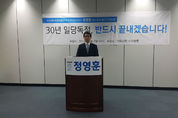 더불어민주당 진주갑위원장 정영훈 변호사가 7일 오전 11시 진주시청 프레스센터에서 기자회견을 열고 진주 갑 지역구에 국회의원 출마를 공식 선언했다. 정영훈 예비후보 출마선언문 전문 존경하는 진주시민 여러분 우리 진주의 마지막 야당 국회의원은 1988년 통일민주당의 (故)조만후 의원입니다. 그 후 지난 30년간 우리 진주는 국회의원도 시장도 모두 특정세력, 특정정당이 독점해왔습니다. 물은 3일만 고여도 상한다는데, 하물며 특정세력이 국회의원과 지방권력을 30년간 독점해 왔으니 어찌 되었겠습니까. 2016년 오늘의 우리 진주정치의 모습은 어떻습니까? 정의롭습니까? 합리적입니까? 자식들에게 자랑할 만합니까? 자존심이 상해도 부끄러움을 감수하면, 특정세력의 경제적 콩고물이 시민여러분께도 떨어집니까? 결코 아닙니다. 왜냐하면 권력과 이익은 소수가 독점할수록 그들의 파이가 커지기 때문입니다. 그래서 헌법 교과서에 “절대권력은 절대부패한다”는 명제가 실린 것입니다. 존경하는 진주시민 여러분! 저는 이번 4.13 총선에서 세 가지 일을 하겠습니다. 첫째, 진주 야권세력의 총단결을 이루어내겠습니다. 당과 노선의 차이를 극복하고, 진주와