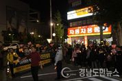 (진주/조권래 기자) = 지난 주말 서울에서는 전국 각지에서 모인 '100만 명 박근혜 대통령 하야촉구 촛불집회'가 열려 박근혜 정권의 국정농단에 대한 민심을 보여줬다. 이런 가운데 대표적인 새누리당의 텃밭인 진주에서도 서울로 가지 못한 시민들이 주최한 시국집회가 열려 박근혜 퇴진을 바라는 진주시민들의 분노를 보여줬다. 진주지역 박근혜국정농단 시국집회 참여자들이 거리행진을 이어가고 있는 모습/ 사진=조권래 이날 집회에는 부모님의 손을 잡고 나온 유아에서부터 박근혜 대통령이 부끄럽다는 초등학생, 이제 중학생이된 1학년생, 서울에서 읽을 예정이었던 시국선언문을 들고 나온 고등학생과 대학생 등의 학생들과 기성세대로 부끄럽다고 밝힌 산청의 한 농부까지 분노에 가득찬 이들이 모였다. 마이크를 잡은 한 70대 농부는 "서울로 가고자 했지만 가지못했다", "나라가 이 지경이됐는데도 버티고 있는 박근혜의 행동을 이해할 수 없다. 오늘 이자리에 나온 학생들에게 부끄럽지 않도록 박근혜가 퇴진할때까지 끝까지 물러서지 않겠다"며 분기를 감추지 못했다. 진주