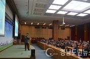 6일 오후 3시 부산시청 12층 국제회의실에서 건설관계자와 건설본부 300여 명이 참석한 가운데 경성대 이민희 교수가 안전교육을 진행하고 있다.