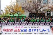 [경남도민뉴스=최재경 기자] 남구새마을회(회장 황병철)는 남구청 후생관 앞 주차장에서 따뜻한 손길이 더욱 필요한 동절기를 맞아 ‘사랑의 김장으로 김장담그기 행사’를 실시했다고 27일 밝혔다. 이번 행사는 26일과 27일 2일간 일정으로 소외되는 이웃이 없는 밝고 인정 넘치는 행복남구 건설을 위해 마련됐고, 남구새마을회(회장 황병철), 남구새마을협의회(회장 서병찬), 남구새마을부녀회(회장 최인순)와 회원 등 150여 명이 참여한 가운데 김장 김치를 담갔다. 서동욱 남구청장도 새마을 지도자와 함께 이웃들에게 따뜻한 정을 나누기 위한 손길을 보탰다. 이날 정성껏 담근 김장김치는 관내 독거노인, 취약계층, 다문화가정, 기초생활수급자 등 400여 세대에 복지시설에 전달할 예정이다. 황병철 남구새마을회장은 “사랑이 담긴 김장 나눔이 이웃들에게 겨울을 따뜻하게 견뎌낼 수 있는 큰 힘이 됐으면 한다” 고 말했다.