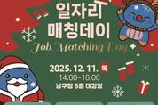 [경남도민뉴스=최재경 기자] 울산 남구(구청장 서동욱)는 올해 마지막 대규모 채용행사인 ‘제12회 일자리매칭데이’를 앞두고 구인기업과 구직자 모집을 본격적으로 시작한다. 이번 행사는 12월 11일 오후 2시부터 4시까지 남구청 6층 대강당에서 열리며 단순한 채용행사가 청년·중장년·여성 생애주기별 직종에 맞춰 아닌 현장면접·취업지원·AI 체험·부대행사까지 한 번에 즐기는‘종합 취업 페스티벌’로 기획돼 누구나 부담 없이 오고 싶은 행사로 구성됐다. 다양한 분야의 기업이 참여해 실제 채용까지 이어지는 기회를 제공하고 현장에서 바로 면접을 볼 수 있으며, 당일 참여하지 못한 기업을 위한 간접참여 서류접수 대행도 동시에 진행해 취업 기회를 폭넓게 마련했다. 또한 전문 취업컨설턴트가 직접 배치돼 1:1 구직상담, 이력서·자기소개서 맞춤 컨설팅, 취업지원사업 안내 등 실질적인 취업지원 서비스도 제공되는데 면접 전에 컨설팅을 받고 바로 면접장으로 이동할 수 있어 구직자들의 호응이 기대된다. ‘AI가 대신 돈 벌어주는 시대, 나도 이제 N잡러!’를 주제로 한 AI 취업특강과 구직자가 스스로의 강점을 재미있게 탐색