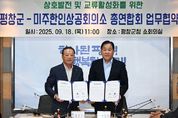 [경남도민뉴스=표재민 기자] 평창군은 18일 오전 11시, 평창군청 소회의실에서 미주한인상공회의소총연합회(총회장 황병구)와 교류 활성화를 위한 업무협약을 체결했다. 이번 협약은 평창군의 우수 특산품과 지역 기업 제품의 미국 시장 진출을 지원하고, 글로벌 비즈니스 역량을 강화하기 위한 협력체계를 마련하기 위해 추진됐다. 협약의 주요 내용은 ▲평창군 특산품의 미국 시장 판로 개척 지원 ▲미국 내 기업 전시회 및 박람회 공동 참여 ▲글로벌 비즈니스 프로그램 공동 운영 등이다. 양 기관은 이번 협력을 통해 기업 간 네트워크를 강화하고, 판로 확대와 투자 유치 등 실질적인 경제적 성과를 창출할 수 있을 것으로 기대된다. 협약 파트너인 미주한인상공회의소총연합회는 미국 전역 50개 주, 78개 지역 상공회의소가 참여하는 최대 규모의 한인 경제 네트워크로, 1980년대 설립 이후 한인 상공인의 권익 보호와 경제 성장 지원을 위해 활동해 온 비영리 민간단체다. 심재국 평창군수는 “이번 협약은 평창군 기업들이 미국 시장에 안정적으로 진출할 수 있는 기반을 마련하는 동시에 지역 특산품을 세계에 알릴 기회가 될 것”이라