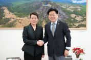 [경남도민뉴스=하형수 기자] 제주특별자치도와 중국 산둥성이 칭다오 항로를 기반으로 한 통상 협력과 친환경 산업 분야 공동 발전을 위한 협력을 한층 강화한다. 오영훈 제주지사는 30일 오전 도청 집무실에서 대외무역과 통상 업무를 총괄하는 왕레이(王磊) 중국 산둥성 상무청장을 비롯한 방문단 7명과 면담을 갖고 양 지역 간 수출입 확대, 칭다오 항로 물동량 증대, 그린수소 등 친환경 산업 협력 방안을 폭넓게 논의했다. 오 지사는 “산둥성과 제주의 우호 협력 관계가 한층 높아진 가운데 칭다오 항로가 새롭게 연결되면서 교류 협력이 급속도로 발전하고 있다”며 “산둥성 정부의 강력한 의지 덕분으로, 도민들과 함께 더 큰 발전을 기대하고 있다”고 말했다. 오 지사는 제주 삼다수의 중국 수출이 5월부터 본격 개시된다는 점을 언급하며 통관 절차의 신속한 처리를 요청했다. 또한 이날 왕레이 청장 일행의 한라산소주 방문 일정과 관련해 한라산소주가 수도권과 미국 시장에서 높은 신장세를 보이고 있다며 산둥성으로부터의 소주병 원료 수입 검토 상황을 설명하고, 한라산소주와 칭다오맥주의 협업(컬래버레이션) 가능성도 제안했다. &