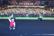 [경남도민뉴스=류종길 기자] 강원특별자치도는 3월 15일 오후 1시30분, 원주 치악체육관에서 '도민과 함께하는♥ 강원 도정보고회' 원주권 행사를 개최했다. 이번 보고회는 2026년 도정 운영 방향인 ‘도민공감 행정’을 현장에서 실현하기 위해 마련된 자리로, 지난 춘천권 행사에 이어 두 번째로 열렸다. 이 자리에서는 도정의 주요 정책과 현안을 도민에게 직접 설명하고 현장의 목소리를 듣기 위한 소통의 장으로 진행됐다. 이날 행사에는 원주권역 도민 7천여 명이 참석해 체육관을 가득 메우며 높은 관심을 보였다. 유상범 국회의원과 박정하 국회의원, 김시성 도의회 의장, 원강수 원주시장, 김명기 횡성군수, 최명서 영월군수, 심재국 평창군수, 신경호 도 교육감 등 주요 인사도 함께해 도정 현안과 지역 발전 방향에 힘을 모았다. 김진태 도지사는 보고회에서 PPT를 활용해 도정 주요현안을 직접 설명했다. 먼저, 김 지사는 '강원특별법 3차 개정안' 추진상황을 보고하며 “통합특별시 출범으로 강원도와 강원특별법이 절대 소외되어서는 안된다”고 재차 강조했다. 이어 “강원특별법 3차 개정안이 내일 국회 심사에 오르기로