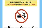 [경남도민뉴스=장광동 기자] 함양군 보건소는 전자담배를 포함한 모든 담배 제품의 금연구역 내 사용을 규제하는 '담배사업법' 개정에 따라 오는 4월 24일부터 5월 15일까지 집중 점검을 실시한다고 밝혔다. 오는 4월 24일 개정되는'담배사업법'은 담배의 정의를 기존 ‘연초의 잎을 원료로 제조한 제품’에서 ‘연초 또는 니코틴을 원료로 제조한 제품’으로 확대했다. 이에 따라 궐련뿐 아니라 궐련형·액상형 전자담배 등 모든 담배 제품이 금연구역 내 사용 금지 대상에 포함된다. 함양군은 법 개정에 따라 담배사업법 시행일인 오는 24일부터 5월 15일까지 경찰 등 유관기관과 합동으로 점검과 캠페인을 실시할 예정으로, 주야간 병행 점검을 통해 금연구역 관리 강화와 함께 담배 규제 사항의 원활한 정착을 유도할 계획이다. 주요 점검 내용은 ▲금연구역·흡연실(흡연구역) 시설 기준 준수사항 여부 ▲금연구역 내 흡연 행위 점검(전자담배 포함) ▲담배 소매점 광고 준수 여부 등이다. 함양군 관계자는 “이번 제도 시행을 통해 그동안 규제 사각지대에 있던 합성 니코틴 담배까지 관리할 수 있게 됐다”라며 “담배 규제 강화와 발