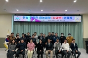 [경남도민뉴스=백형찬 기자] 거창군은 10월 31일 거창군농업기술센터 내 미래농업복합교육관에서 교육생 30명을 대상으로 ‘2025년 귀농귀촌인 영농대학 사과반’ 수료식을 개최했다고 밝혔다. 거창군 영농대학은 지난 5월 23일 오상진 강사의 ‘사과재배 환경과 사과원 조성’ 강의를 시작으로 병해충 관리, 과실의 성숙과 저장 기술, 사과의 부가가치 창출 등 재배 기초부터 가공, 판매까지 15회에 걸쳐 60시간 교육으로 운영됐다. 올해 영농대학 교육생 30명 중 교육 시간 45시간 이상을 수강한 22명이 수료했으며, 수료생들은 교육생 커뮤니티 구축 및 농업 관련 지원사업에 가점 혜택을 받게 된다. 김규태 농업기술센터소장은 “농사와 생업으로 바쁜 가운데에도 꾸준히 교육에 참여해 지식을 쌓아가신 수료생 여러분의 열정에 진심으로 감사드린다.”며 “이번 교육을 통해 배운 전문 기술이 현장에 잘 접목되어 거창 사과 산업이 한층 더 발전하길 기대한다.”고 말했다. 한편, 거창군 귀농귀촌인 영농대학은 매년 2∼3월경 읍면사무소를 통해 농업인이 필요로 하는 작목 교육 수요조사를 통해 과정을 편성하고 있어 농업인의 만족도를 높이고 있다.