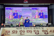 [경남도민뉴스=백형찬 기자] 거창문화원은 지난 22일 경남문화원연합회가 주최, 거제문화원 주관한 ‘제3회 경남 문화한마당’ 행사에 참가해 으뜸상을 수상했다고 전했다. 이번 문화한마당 행사는 거제 실내체육관에서 경남 20개 시군 문화원 공연팀과 관계자 800여 명이 참석해 그동안 쌓아온 실력을 마음껏 뽐내며 열띤 경연을 펼쳤다. 거창문화원에서는 거창 청춘실버연극반(회장 정영애)이 “엄마의 악극”으로 경연에 참여했다. 경연 결과, 참여 19팀 중 14팀이 수상했으며, 그중 거창문화원이 1등 상인 ‘으뜸상’을 수상했다. 수상작인 ‘엄마의 악극’은 평생 자식에게 사랑과 희생만 하다 쓸쓸히 늙어가는 우리 엄마를 잘 표현했음은 물론 인간적인 따뜻함을 동시에 담아내 관객과 심사위원의 큰 호응을 얻었다. 안철우 거창문화원장은 “정말 영광스러운 일”이라며 “고생한 우리 연극반 회원들 감사드리고, 늘 성원해 주는 거창군에 감사드린다”고 소감을 전했다.