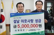 (경남도민뉴스) = 함양군은 28일 오전 11시 NH농협은행 함양군지부 김우식 지부장 등이 군수실을 방문해 설 명절을 맞아 관내 저소득층에게 전달해 달라며 농산물 상품권 500만 원을 기탁했다고 밝혔다. 함양군은 이날 기탁 받은 상품권을 차상위계층, 중위소득 80%이하의 저소득가구를 대상으로 각 읍·면의 추천을 받아 5만 원씩 100세대에 전달할 예정이다. 김우식 지부장은 “설 명절을 맞아 지역의 어려운 이웃들과 조금이나마 어려움을 함께 나누고 전통시장의 활성화에 작은 도움이 되기를 바란다”고 전했다. 서춘수 함양군수는 “설 명절을 앞두고 뜻 깊은 기탁을 해주셔서 감사하다.”며 “농산물 상품권을 통해 함양군의 지역경제 활성화에 많은 도움이 될 수 있도록 적극 노력할테니 많은 관심과 협조를 부탁드린다”고 밝혔다.